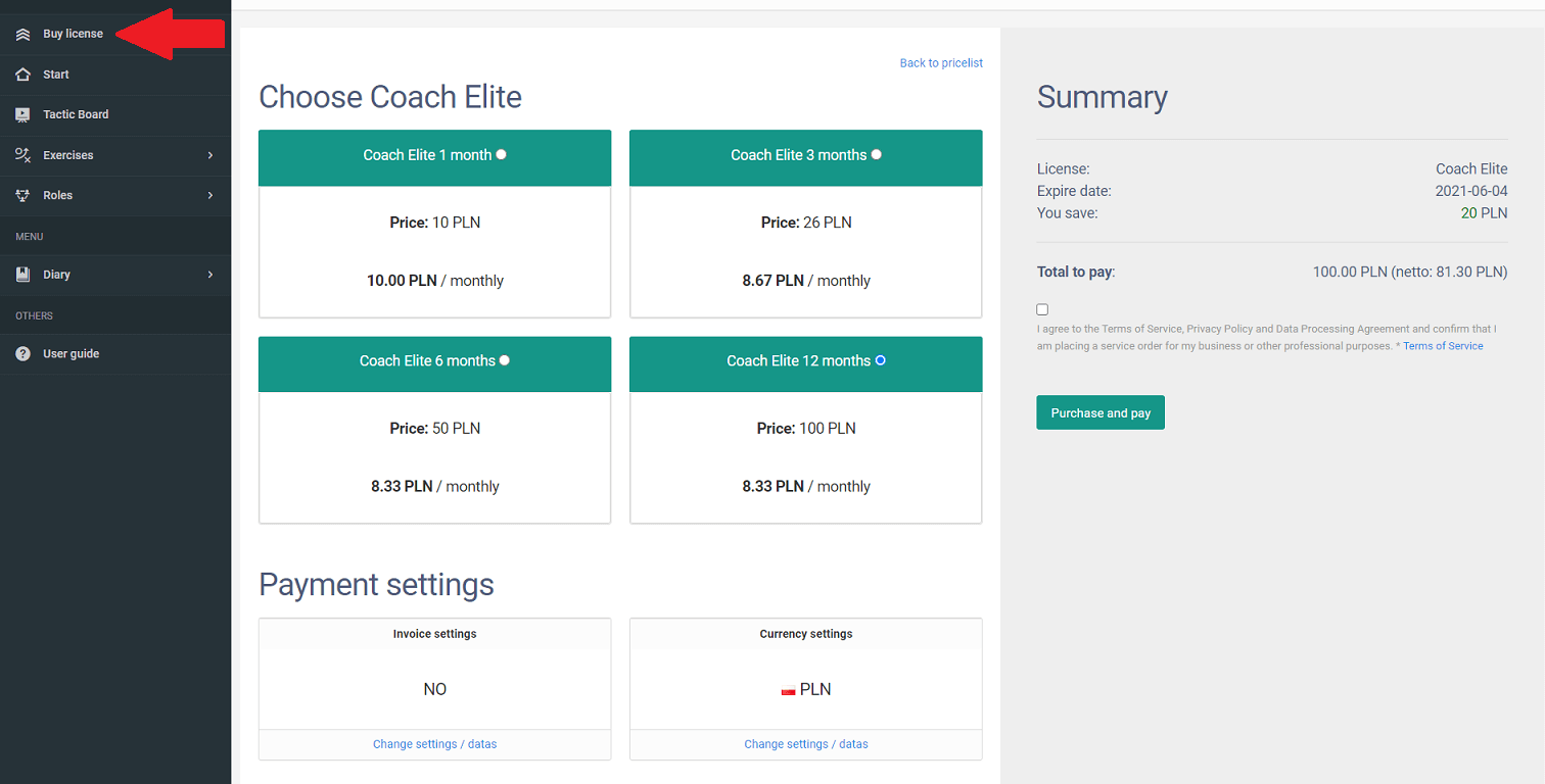 Voordat je een licentie koopt, kun je genieten van ons Coach Free account. Je kunt meer leren over de licentie op de prijslijst. Als je besluit een individuele licentie te kopen, moet je een actief traineraccount hebben. Na het inloggen in het systeem, selecteer de optie "koop licentie" uit het linkermenu. Selecteer het pakket waarin je geïnteresseerd bent en de geldigheidsperiode. Als je een factuur nodig hebt, vul de benodigde gegevens in en ga door naar betaling. De betaling gebeurt via het betaalplatform - DotPay. Je licentie wordt direct actief nadat je overschrijving door ons is ontvangen.