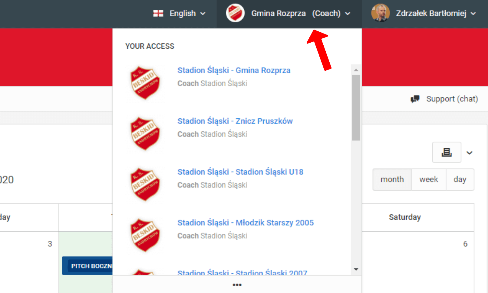 Het systeem geeft je de mogelijkheid om meer dan één rol te hebben. Dit betekent dat je met één login en wachtwoord het systeem kunt gebruiken als: ouder, speler, coach, coördinator of hoofdbeheerder van de club. Om te schakelen tussen je rollen, klik je op de knop met je momenteel geladen rol in de rechterbovenhoek. De volgende stap is het selecteren van de rol die je als actief wilt laden. Het wijzigen van een rol kan resulteren in een wijziging van het toegangsniveau van het systeem. Een meer gedetailleerde lijst met rollen kun je vinden in het linkermenu onder "Toegangen".
