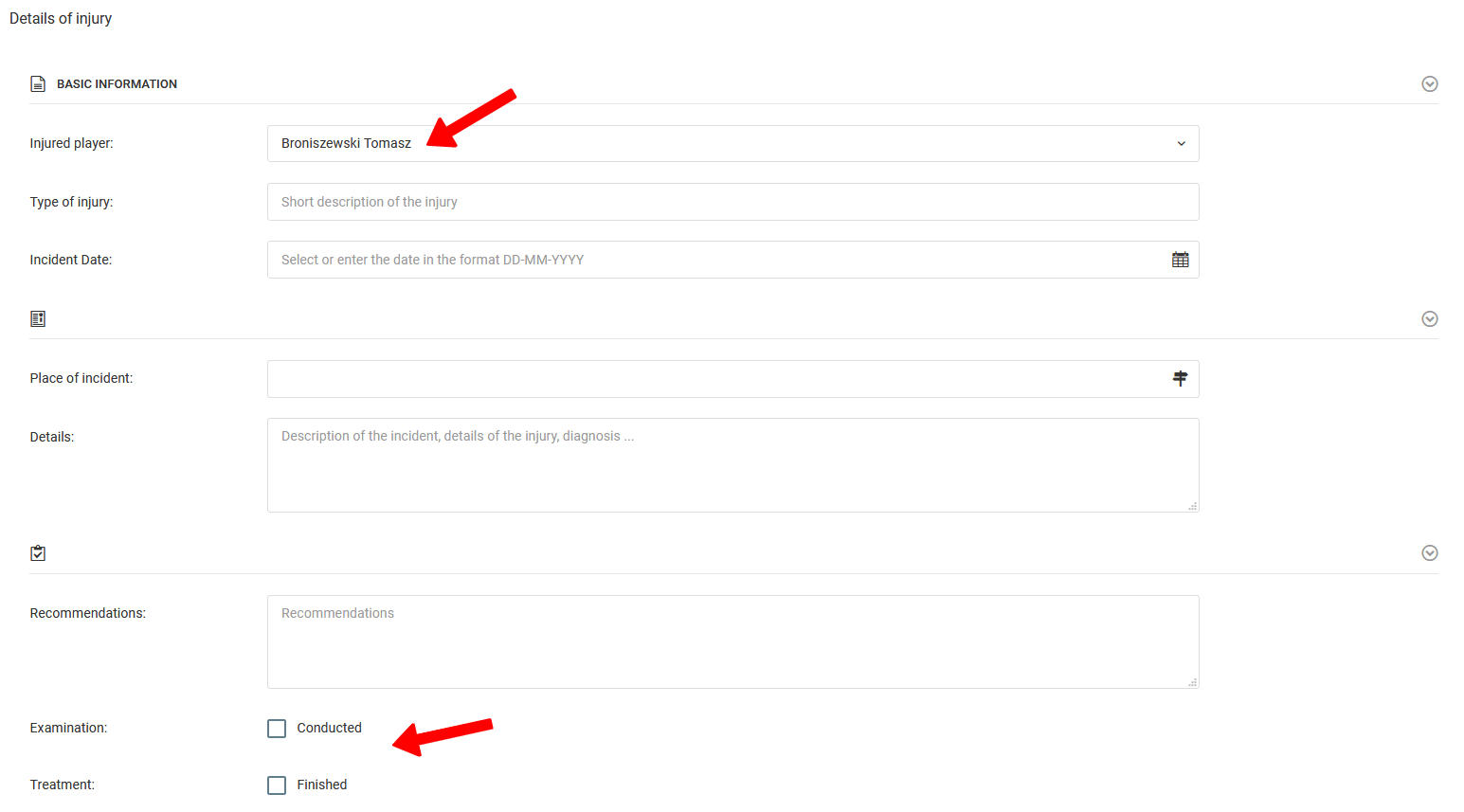 Om een blessure toe te voegen, selecteer uit het linkermenu dagboek blessures blessure toevoegen. Vul de vereiste gegevens in het formulier in dat verschijnt, beginnend met de naam van de geblesseerde speler. De ingevoerde blessure kan op elk moment worden aangepast, bijvoorbeeld om een controledata in te stellen of de behandeling te beëindigen.