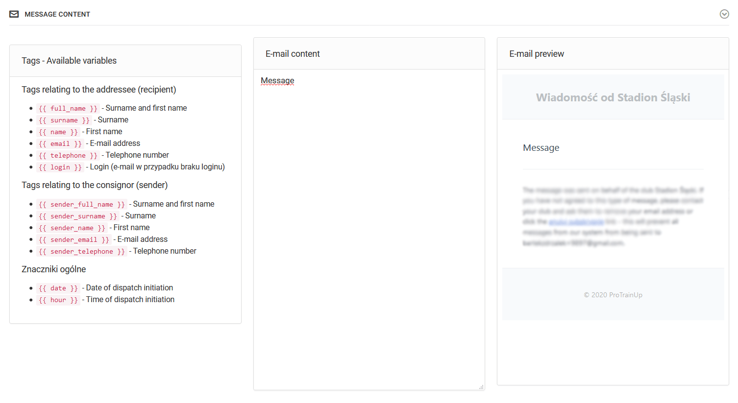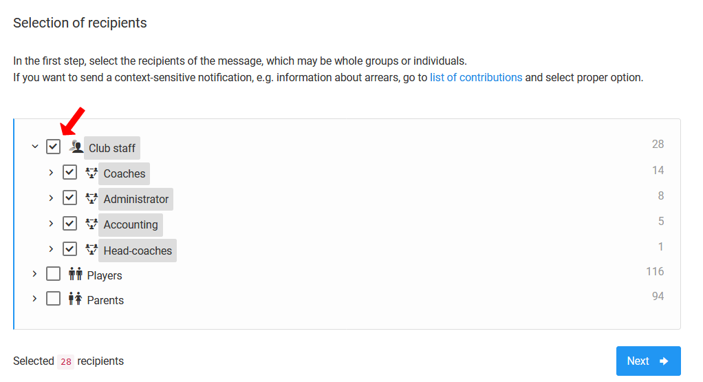 Voordat je berichten naar ontvangers stuurt, let op de mogelijkheid om filters te gebruiken. Je hebt drie niveaus van filtering beschikbaar: volledig - je ontvangt één bericht, zelfs als je veel rollen in de club hebt (ouder van meerdere kinderen), intelligent - je slaat duplicaten over van mensen die vergelijkbare rollen hebben, bijvoorbeeld de gebruiker zal duplicaten van ontvangers zoals een ouder met twee kinderen niet missen, geen filtering - één persoon kan een vergelijkbaar of hetzelfde bericht meer dan eens krijgen als hij verschillende rollen in de club speelt.