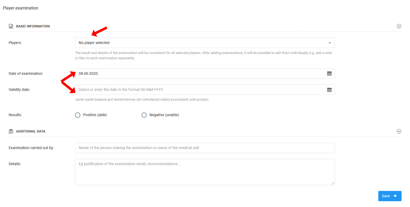 Om informatie over medische keuringen in te voeren, selecteer je in het linkermenu dagboek keuringen keuring toevoegen. Wanneer je hierop klikt, word je naar de informatie-invoerpagina voor de keuring gebracht. Op deze pagina heb je verschillende belangrijke elementen om in te voeren. De eerste is een lijst van spelers die betrokken zijn bij de keuring. Dit kunnen alle spelers zijn, een specifieke groep of een enkele speler. De volgende belangrijke velden zijn: de datum van de keuring en de vervaldatum van de keuring. Daarnaast kun je het resultaat van de keuring markeren (geschikt/ongeschikt) en de details toevoegen van de persoon die de keuring uitvoert.