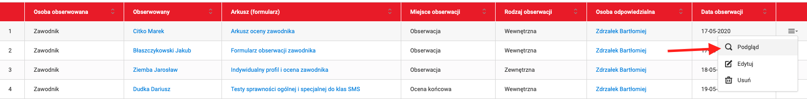 Om het voorbeeld van een observatie te bekijken, selecteer je de tabbladen uit het linkermenu Club Evaluaties en observaties Lijst van observaties. Zoek vervolgens een observatie en druk op de "voorbeeld" knop in het menu in de laatste kolom. Je kunt de observatie ook bewerken of verwijderen.
