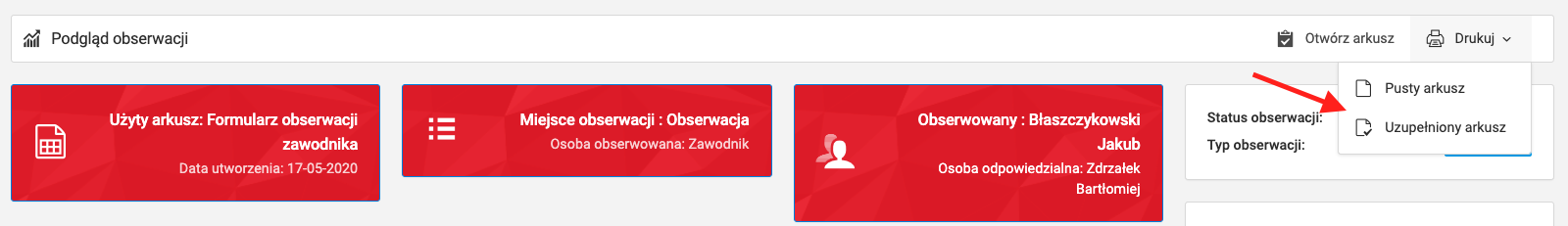 Zoals vermeld in het hoofdstuk over observatie, toont het observatie voorbeeldscherm de belangrijkste gegevens betreffende de evaluatie. Bovenaan zie je gegevens variërend van het type observatie en wie er geobserveerd werd tot welk formulier er gebruikt werd. In de rechterbovenhoek staat een print knop. Je kunt zowel lege als ingevulde formulieren in PDF-formaat printen.