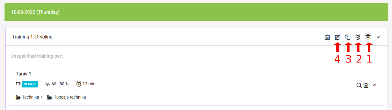 Boven elke trainingssessie, in de rechterbovenhoek, zijn er extra opties die je op elk moment kunt gebruiken. De eerste (1) is om de training volledig te verwijderen, de tweede (2) is om de training te annuleren. Door op dit icoon te klikken verschijnt er een pop-up waar je de reden voor het annuleren van de training kunt specificeren en de optie kunt aanvinken om een melding naar deelnemers te sturen. De derde positie (3) is om de training te kopiëren. Hiermee kun je de training niet alleen van dag tot dag kopiëren, maar ook tussen de teams die je leidt. Het vierde (4) icoon opent het trainingsbewerkingsvenster.