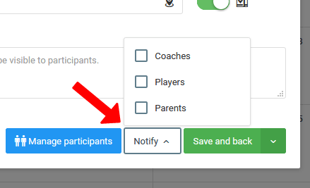 Wanneer je een training aanmaakt, kun je een lijst van deelnemers (spelers) en trainers (staf) instellen. De geselecteerde spelerslijst komt overeen met de spelerslijst in de aanwezigheidslijst bij het controleren. De lijst van trainers die zijn gemarkeerd als stafleden van een bepaalde training wordt getoond op het concept. Hier kun je ook een speler uit een ander team aanwijzen voor de geplande training. De melding aan deelnemers over de training is gebaseerd op de selectie van gebruikersgroepen naar wie de melding wordt gestuurd. Deze verschijnt zowel in de mobiele app als in de online versie van het systeem.
