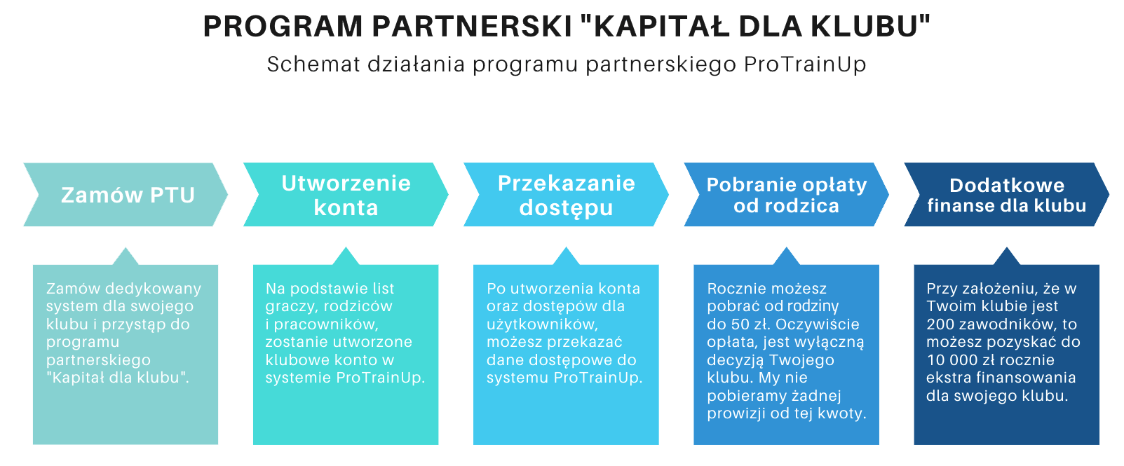 De basis van dit programma is om 90% van het bedrag dat door de club of ouders wordt betaald voor toegang tot het ProTrainUp systeem over te dragen. Door het tekenen van een overeenkomst met ProTrainUp wordt de club de beheerder van inloggegevens en wachtwoorden voor ouders en spelers. De jaarlijkse kosten voor toegang voor de speler en twee ouders hangt af van de geselecteerde licentie tussen 15 EUR tot 25 EUR. De club kan uiteraard afzien van kosten voor ouders en spelers voor toegang tot het systeem.