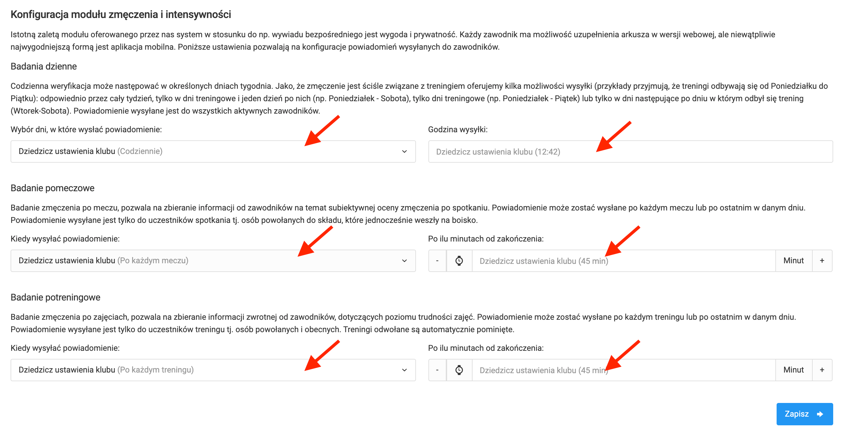 Konfiguracja powiadomień dotyczy trzech dostępnych ich typów. W przypadku badania dziennego w polu wyboru dni, w które zawodnika ma otrzymywać powiadomienie masz następujące opcje: wyłączone, codziennie, w dni treningowe + dzień po, tylko w dni treningowe lub tylko w dni po treningu. W przypadku badania zmęczenia pomeczowego i po treningowego masz do wyboru dwie opcje wysłania powiadomienia: po każdym meczu/treningu lub po ostatnim meczu/treningu danego dnia. Ponadto do uzupełniania mamy godzinę wysyłki powiadomienia (badanie dzienne) oraz czas w minutach po treningu/meczu. Po uzupełnieniu danych we wszystkich polach, kliknij w niebieski przycisk "zapisz".