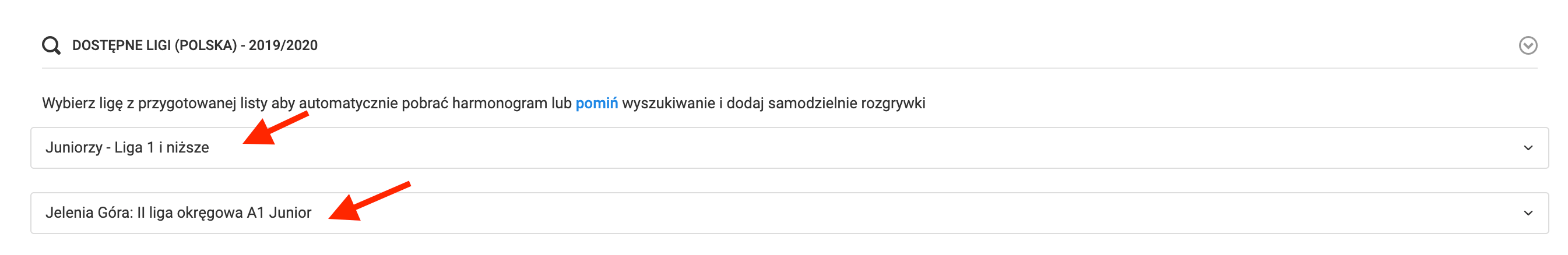 Sezon to nadrzędna jednostka czasu w systemie i powinien się zawsze trwać na przestrzeni dwóch lat kalendarzowych np. od czerwca 2020 do lipca 2021. Wstęp ten celowo się tutaj pojawił, ponieważ trzeba w systemie rozróżnić rozgrywki od sezonu. W ramach sezonu możemy stworzyć dowolną liczbę rozgrywek, które mogą na siebie nachodzić, każde mogą mieć osobą tabele ligową czy osobny terminarz. Aby dodać nowe rozgrywki kliknij w lewym menu systemu w zakładkę dziennik rozgrywki dodaj rozgrywki. System daje do dyspozycji dwie opcje dodawania rozgrywek. Pierwsza z nich jest dostępna jedynie dla drużyn biorących udział w oficjalnych rozgrywkach PZPN, polega na zaciągnięciu gotowych terminarzy meczowych dla wybranej ligi z bazy rozgrywek aktualizowanej przez nas dwa razy do roku.